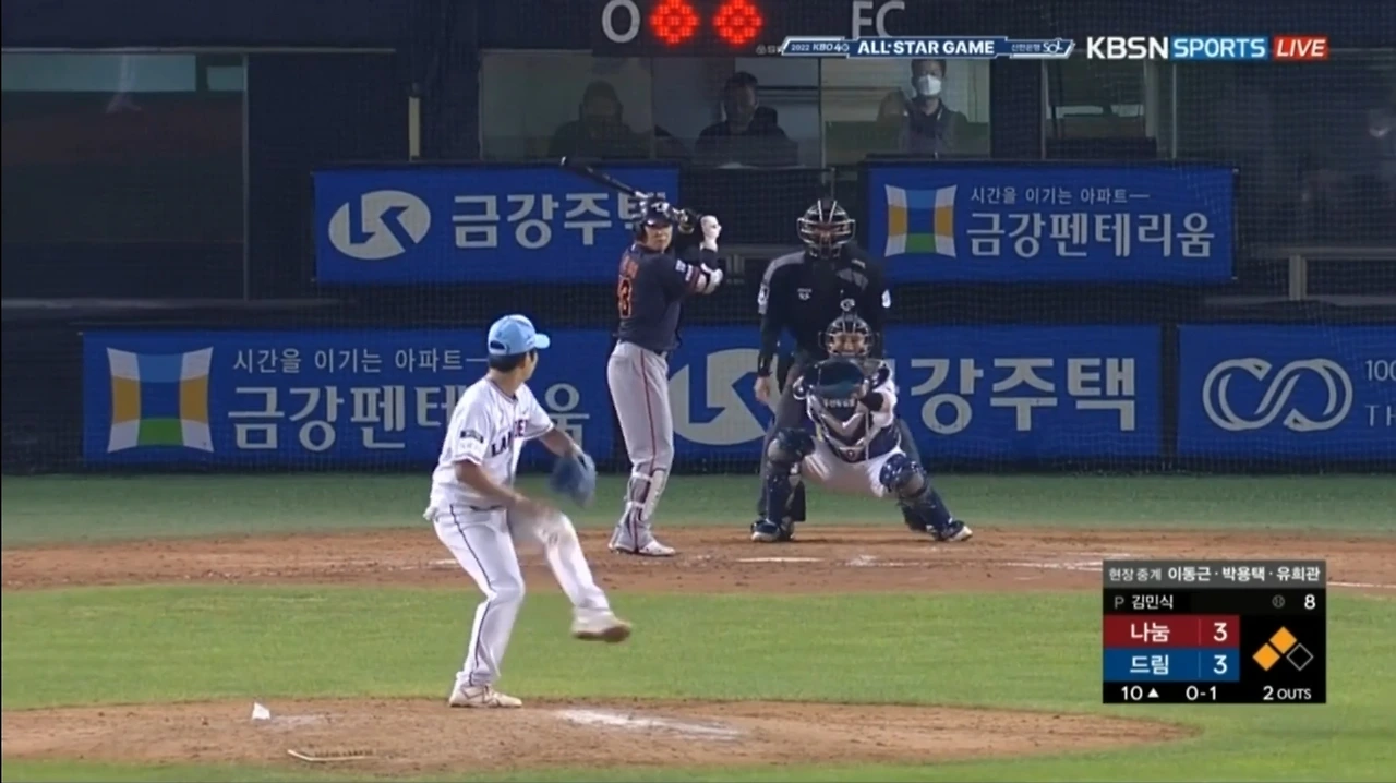 그리고 올스타전의 진주인공 투수 김민식의 차례입니다. 주 포지션이 포수인 SSG 랜더스 김민식 선수는 컨디션 난조로 등판하지 않은 오승환을 대신해 마운드에 올라 첫 타자에게 안타를 맞았으나 한화 수베로 감독의 다소 무리했던 풍차 돌리기로 인해 홈으로 쇄도했던 최형우를 잡아내면서 1아웃, 후속 타자를 땅볼로 처리하면서 2아웃을 잡았지만 정은원에게 3점 홈런을 맞으면서 패전 투수가 되었고 정은원은 이 홈런으로 올스타전 MVP까지 되었습니다. 아이러니하게도 10회 말 세이브 상황에서 진짜 마무리 투수 고우석이 올라오자 야유가 쏟아지는 상황까지. 웃자고 한 거죠.