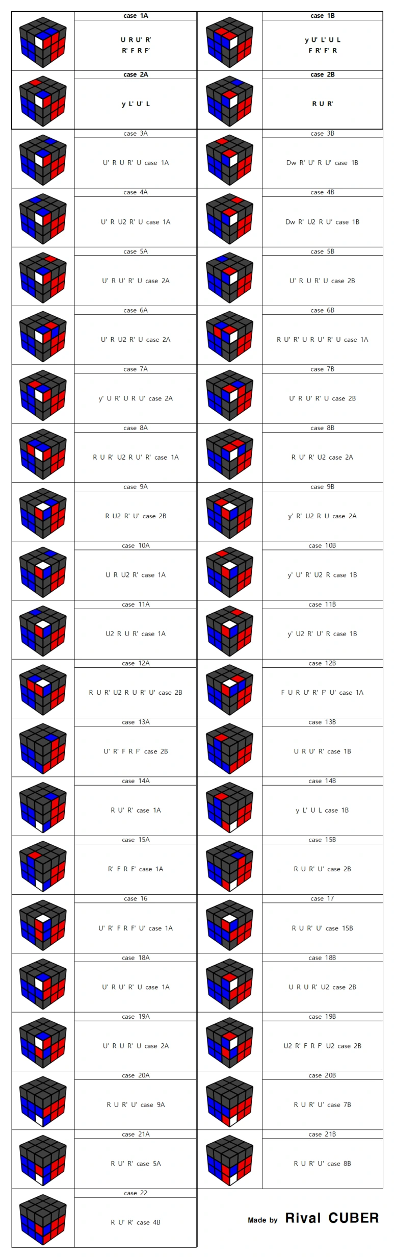 유도 F2L은 3x3x3 큐브 대부분의 고급 해법에서 거치는 단계인 F2L의 기본 41 케이스를 3~4 회전으로 해결할 수 있는 기본형 4개로 유도하여 해결하는 방식입니다. 다음 표에서 굵은 선으로 묶여있는 4개의 케이스를 기본형이라고 합니다.