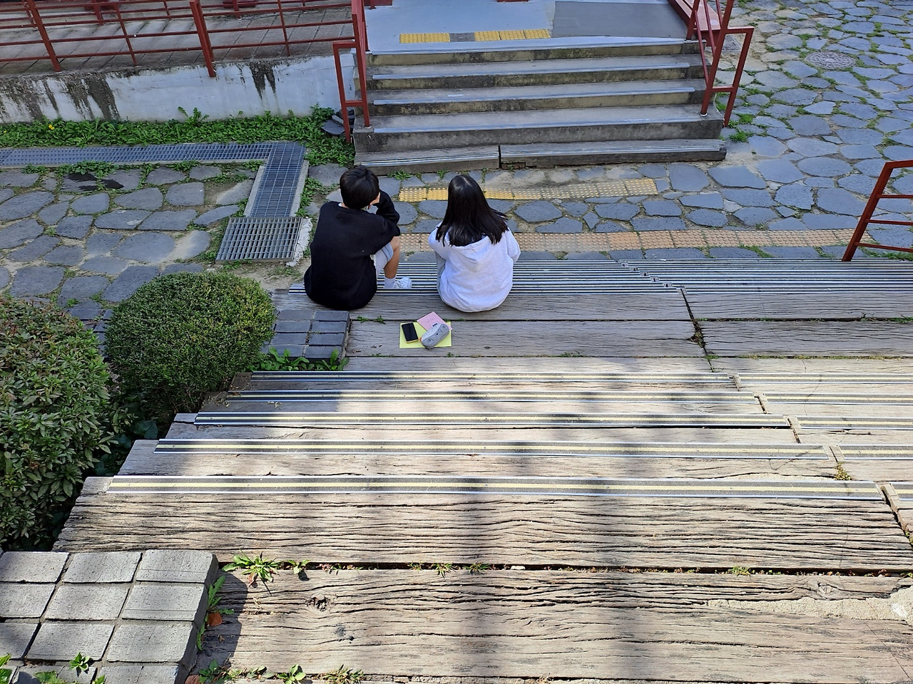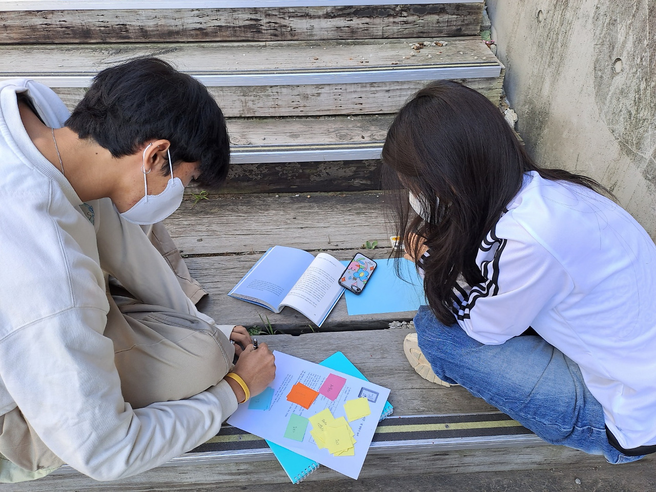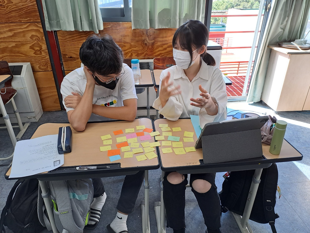 '오늘 시 창작 수업, 둘이서 함께 시를 쓰고 있는 아이들'