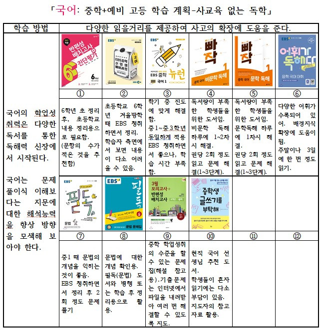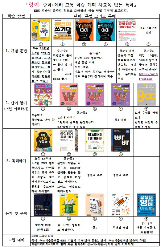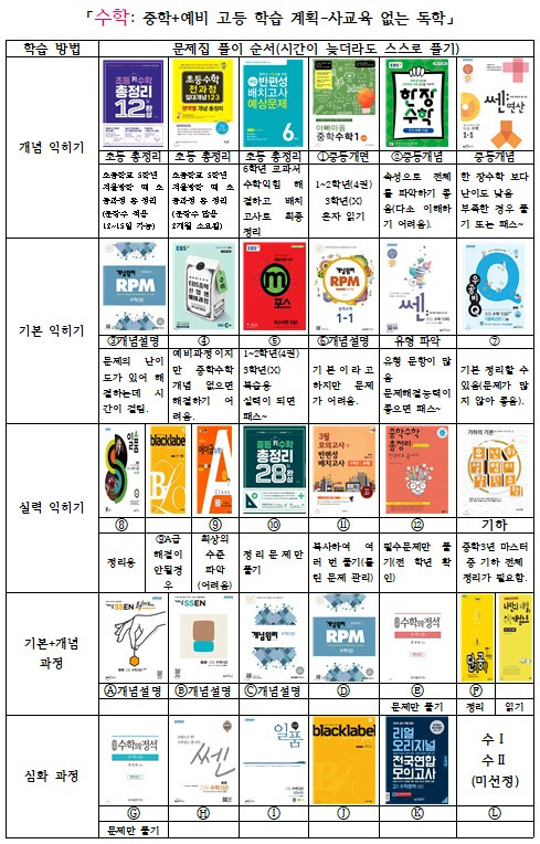 국어: 문법+독해(문학, 비문학), 수학: 기초+기본+심화+최상위, 영어:문법+독해, 과학과 사회: 용어 이해+전문지식(과학의 바탕 수학, 사회의 바탕 국어) 등을 정리한 자료를 공유하겠습니다. 극히 개인적으로 정리한 자료로 다소 편향될 수도 있으니, 참고만 하시면 될 듯합니다.