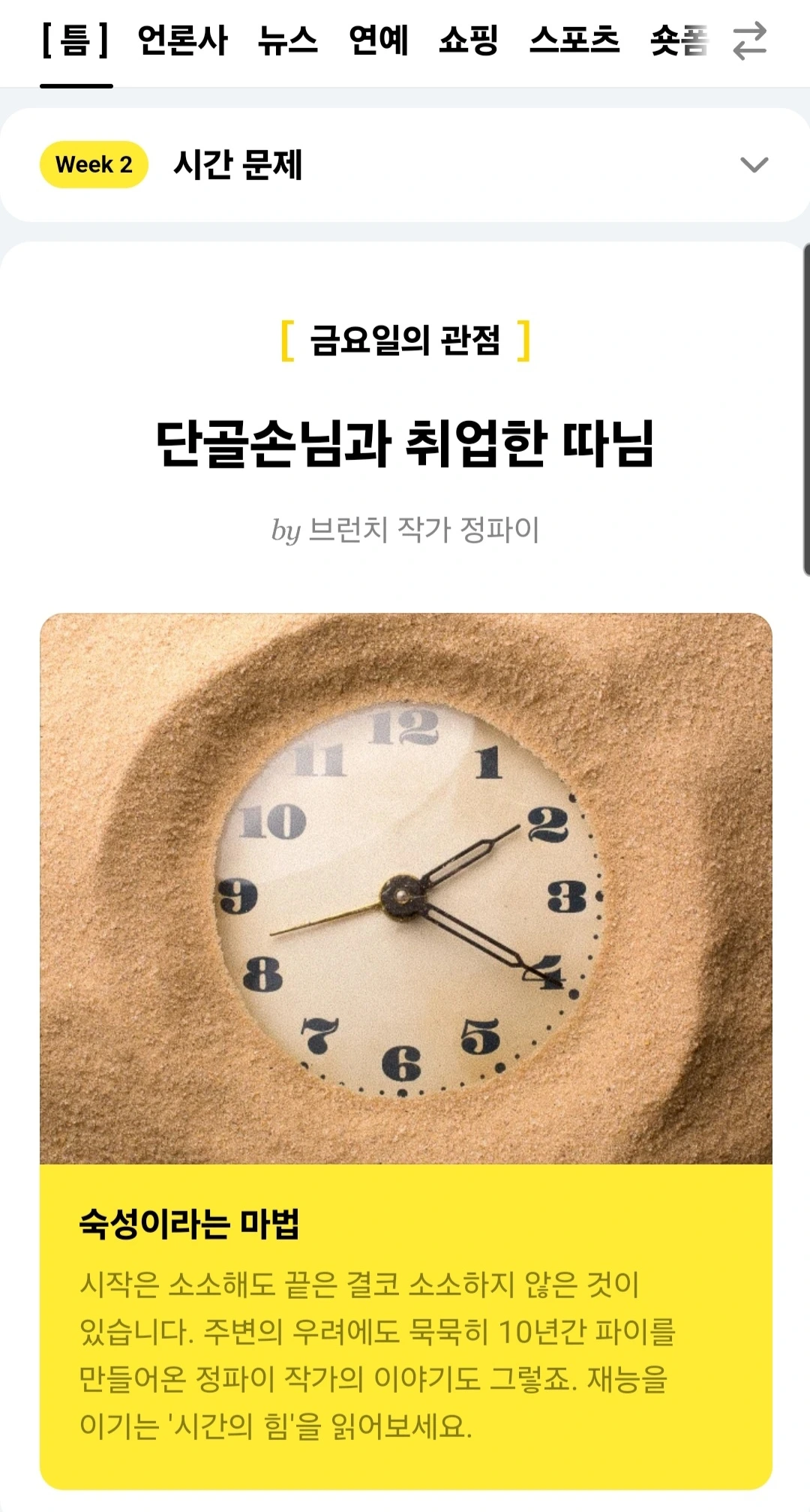 메인화면 맨 앞에 [틈]이라는 챕터에 내 글이 떡하니 올라와 있었다.