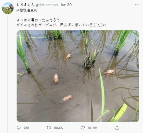 그해 여름이 시작될 무렵, 충격적인 기사를 접하게 되었다. 일본에 기록적인 폭염이 닥쳐서 섭씨 40도까지 기온이 올라갔고, 친환경 농법을 위해 논에 풀어놓았던 가재들이 빨갛게 익은 채로 떠올랐다는 기사였다.