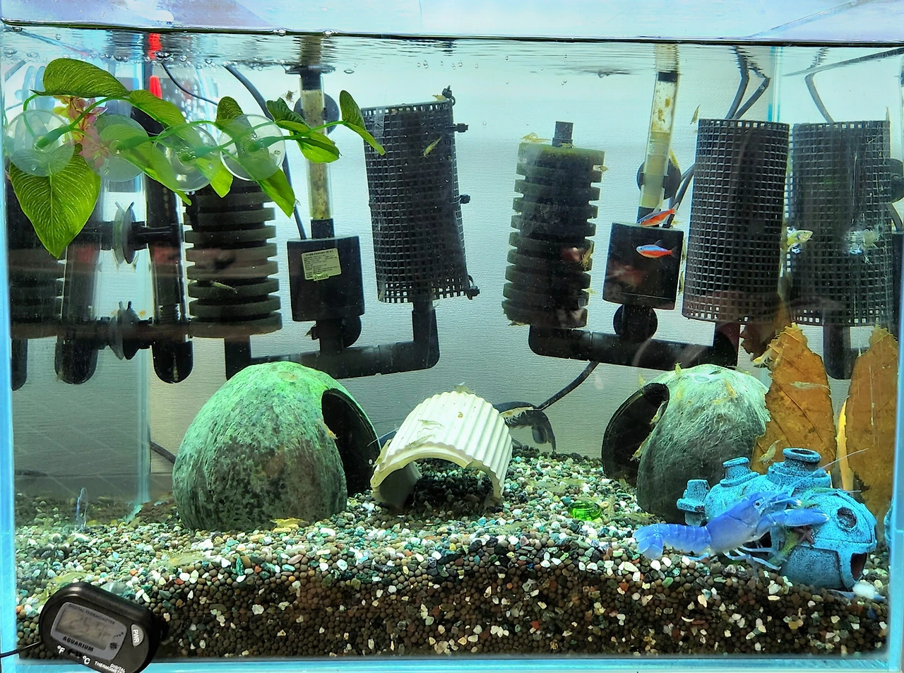 이상하게도 수온이 계속 높았다. 얼음팩을 어항뚜껑에 올려놔 보기도 하고, 다이소에서 사 온 집게 달린 선풍기를 어항 위에 설치해서 돌려줘보기도 했지만 수온은 계속해서 30도까지 올라갔다.
