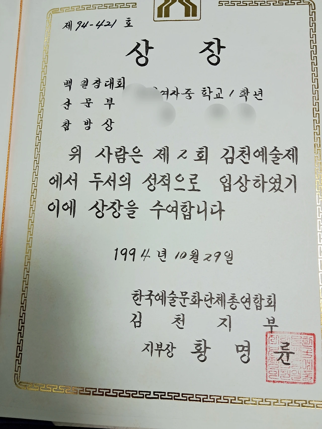 내 간절함과 약간의 짜증 섞인 말투에 장롱 속을 샅샅이 뒤져 남아있는 단 하나의 상장을 찾아냈다. 중1 때 백일장에서 받은, 역시나 참방 상장이다.