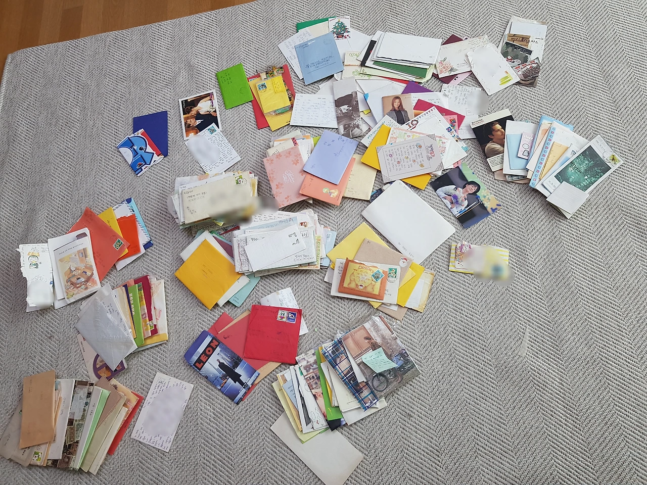 지난주, 20세기에 뽀뽀뽀 분식을 함께 다녔던 J가 집에 놀러 왔다. 내가 소장하고 있는 그녀의 편지를 보여주겠노라 늘 말했었는데 드디어 그 순간이 왔다. 이리저리 뒤섞인 편지들 틈에서 그녀의 것만 찾아내기는 불가능했기에 카펫 위에 모조리 쏟아부었다. 생각보다 많은 편지와 크리스마스 카드에 우린 놀랐고 희귀한 소장품이라도 본 것처럼 들뜬 마음이었다. J와 나는 편지들을 보며 박장대소를 했고 중고등 시절에 대한 수다가 이어졌다. 즐거운 수다타임을 보내고 다음에 또 만날 것을 기약하며 서둘러 둘째의 하굣길을 나섰다.