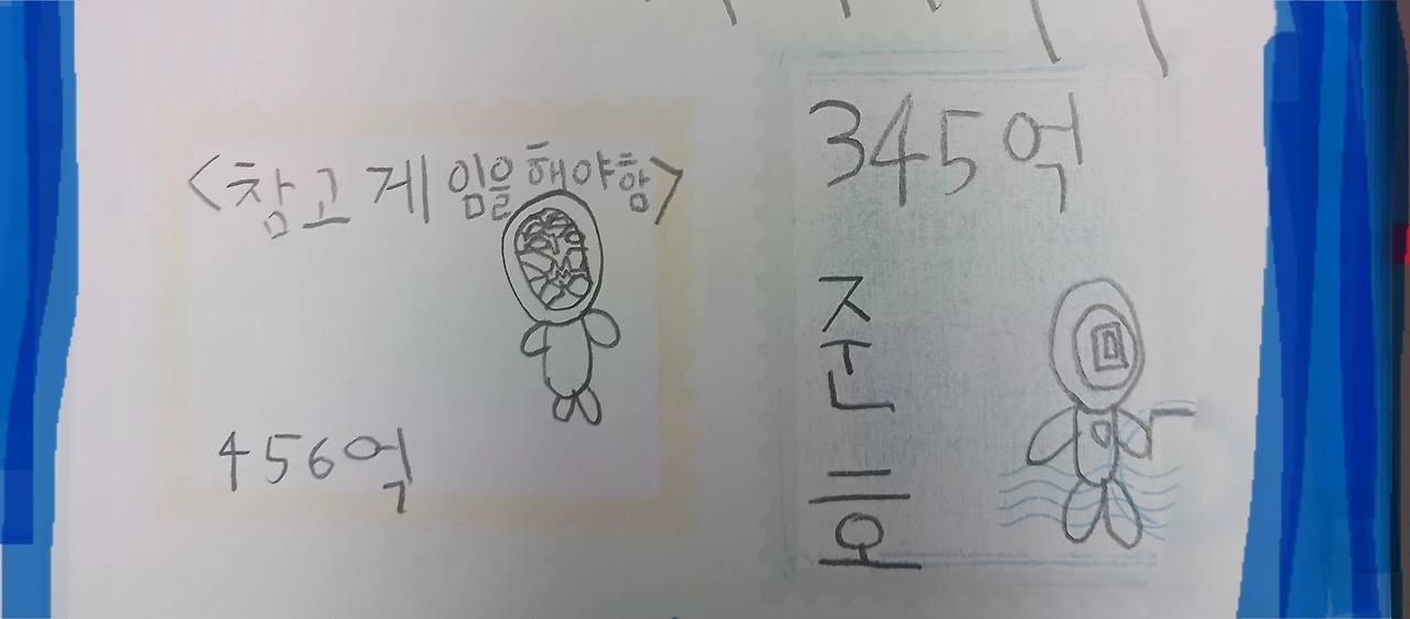 위인들이 등장하는 지폐와 우표를 설명하고, 나만의 지폐와 우표에는 무엇을 그릴것인지 활동지 작성을 했다. 역시나 아이의 종이는 오겜주인공이 차지했다.