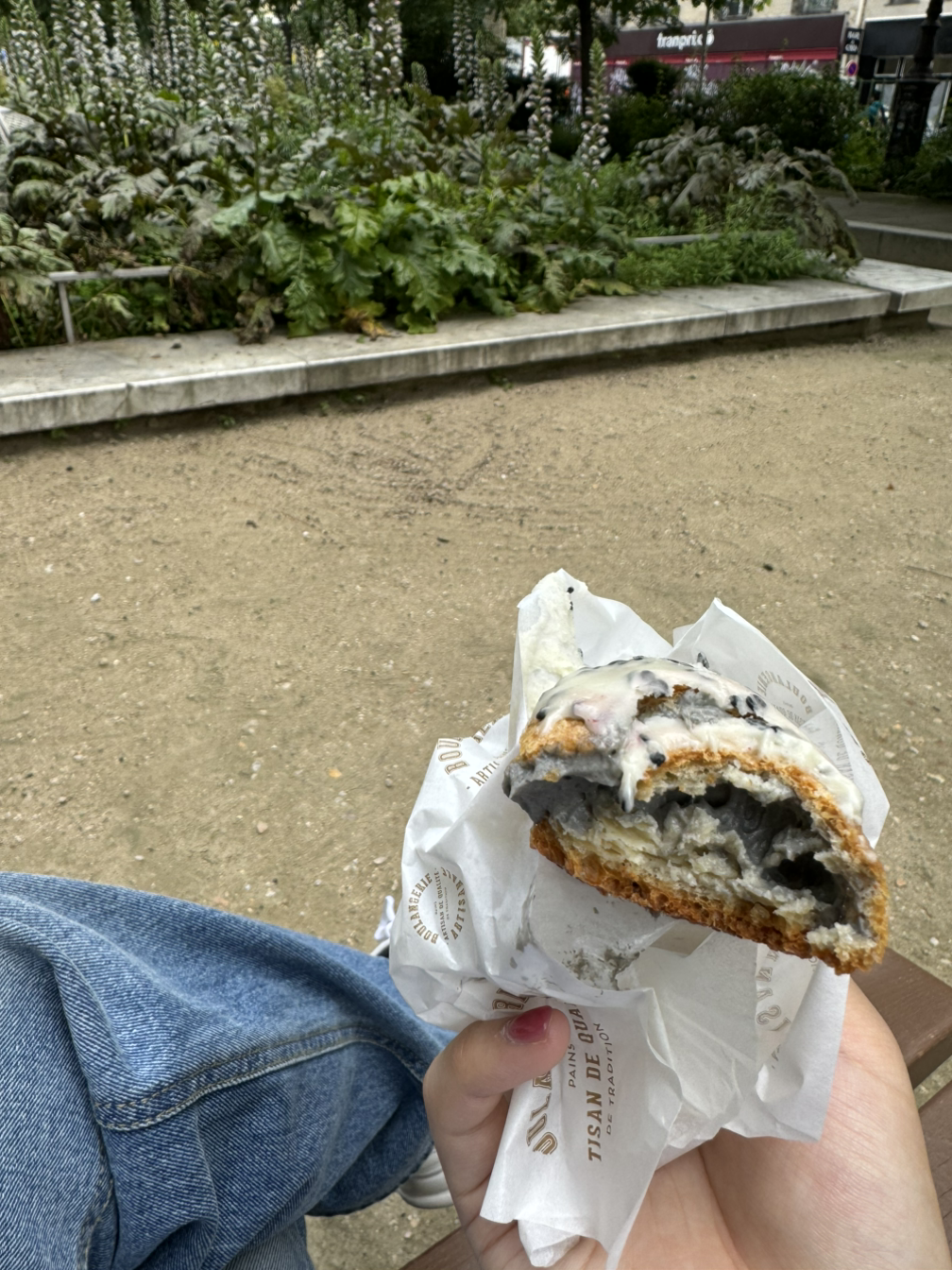 원래는 센 강에서 빵을 먹을 예정이었는데 가는 길에 작은 공원이 있어서 공원에서 빵을 먹었다. 먼저 흑임자 에끌레어부터 먹었다. 첫 입은 “어라?” 싶은 맛이었고, 한입을 더 먹었을 땐 “오 맛있다..”라는 말이 나도 모르게 나왔다. 그러면서 어떤 나라든 프랑스 디저트는 절대 따라잡을 수 없다는 걸 에끌레어로 또 한 번 깨달았다.