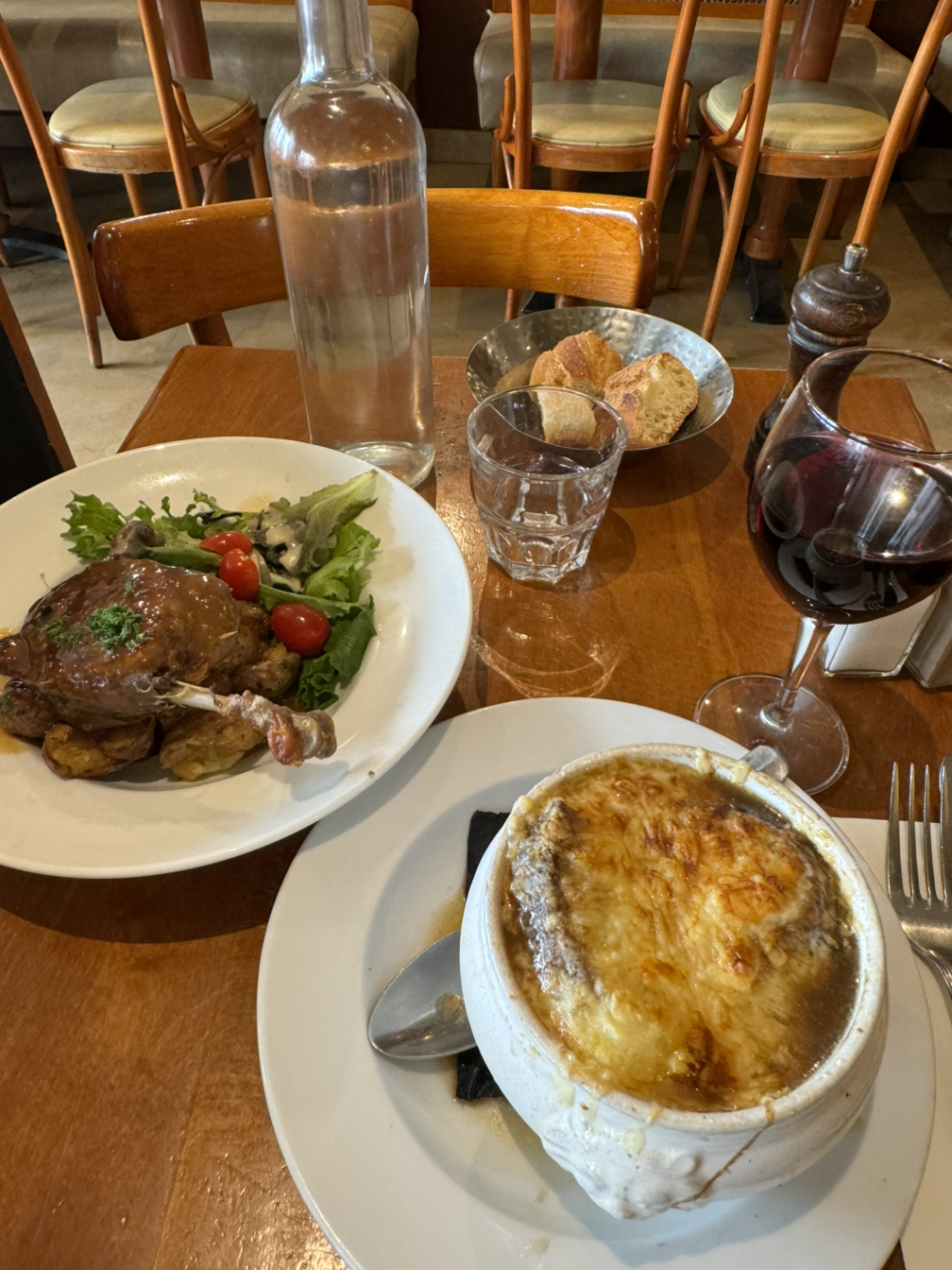 먼저 레드와인이 나왔다. 와인의 맛은 내 마음처럼 꽤 씁쓸했다. 그 씁쓸한 마음을 느끼고 있던 중에 어니언 수프와 바게트, 오리 콩피가 나왔다. 역시 음식은 너무 맛있었고, 와인이랑도 너무 잘 어울려서 입안이 행복했다.