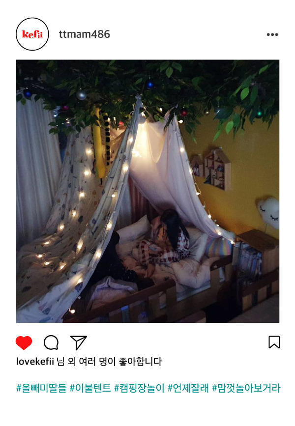 어릴 적 두 살 터울의 동생과 방을 같이 썼던 나는 누구의 방해도 받고 싶지 않아 아지트를 만들겠다고 찾아다녔다. 영화의 한 장면처럼 느티나무 위에 자리 잡은 통나무집을 상상하며 말이다. 비밀의 공간을 만들겠다는 의지로 온 동네를 헤집고 다녔던 기억이 아직도 선명하다. 36개월 된 아들도 나를 닮았는지 비좁은 틈에 몸을 꾸겨 넣고 편안해한다. 식탁 밑부터 침대 구석 등 장소가 다양해 숨바꼭질하기 일쑤였는데 어쩔 땐 세탁기에 들어갈 뻔해 마음이 철렁한 날도 있다. 최근에는 아들의 성향을 고려해 다양한 너구리굴을 만들어주곤 한다. 그중 가장 효과적인 방법은 SNS에서 발견한 꿀팁. 빨래 건조대의 양 날개 끝을 접고 이불을 그 위에 깔면 아늑한 아지트가 완성된다. 애착 인형과 좋아하는 장난감을 넣어주면 내 할 일은 끝! 한 발짝 떨어져 아들의 표정을 살피곤 하는데 그리 편안해 보일 수 없다. 불안한 마음으로 아이를 찾는 숨바꼭질도 이제 안녕이다!