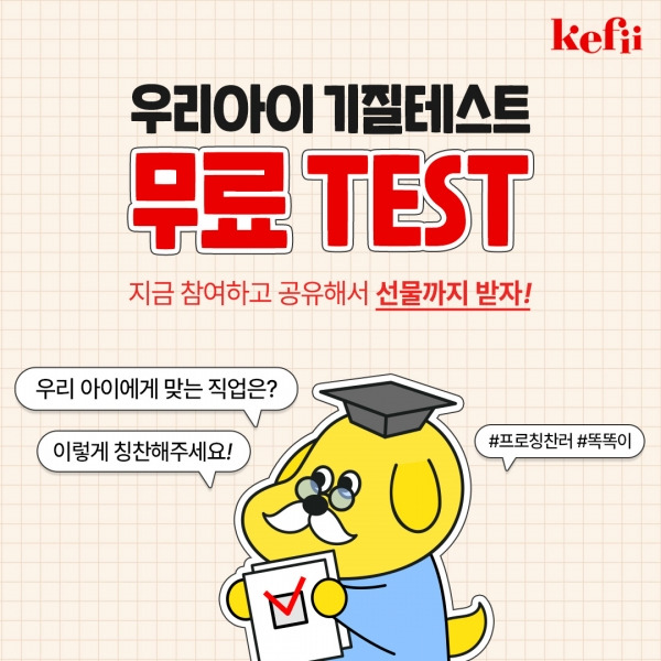 먼저 아이가 가지고 있는 기질에 대한 테스트를 해보세요. 간단한 테스트 후, 더 정확하고 세밀한 기질테스트를 해보고 싶다면 케피가 준비한 우리아이 기질테스트를 해보세요. 우리아이 기질 테스트는 육아 부모라면 겪어 봤을 상황들을 재미요소를 더해 12개의 질문으로 구성돼 있어요. 아이의 예상 결과는 각 유형마다 귀여운 캐릭터와 함께 유형별 해설을 확인할 수도 있답니다! 특히 아이의 기질과 어울리는 추천 직업과, 이런 말로 아이에게 칭찬을 해주었을 때 효과적일 것이라는 개인화된 육아정보도 세심하게 알려주니까 궁금하신 분들은 꼭 해보고 아이들에게 적용해보세요!