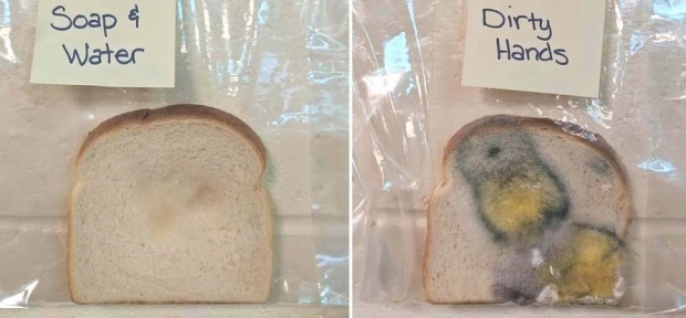 더러운 손으로 만진 빵과 비누로 손을 씻은 다음 만진 빵이 어떻게 변하나 관찰하는 거예요. 세균이 우리 눈에 보이지 않기 때문에 이렇게 간접적으로라도 관찰하는 것이 손 씻기의 중요성을 깨닫는데 좋을 거예요.