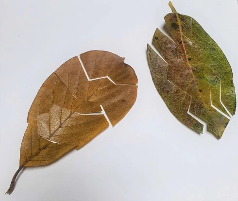 커다란 낙엽을 찾은 다음, 낙엽을 퍼즐처럼 조각내 보세요. 나뭇잎을 가위로 잘라서 아이가 맞추게 해 보세요. 처음에는 조각의 수를 3개로 시작하고, 점점 조각 수를 늘리며 단계를 높이며 아이와 함께 조각을 맞추세요. 조각 개수가 증가할수록 난이도가 올라가니 아이 연령에 맞춰 조각수를 조절해주세요.