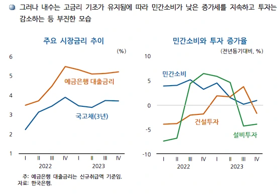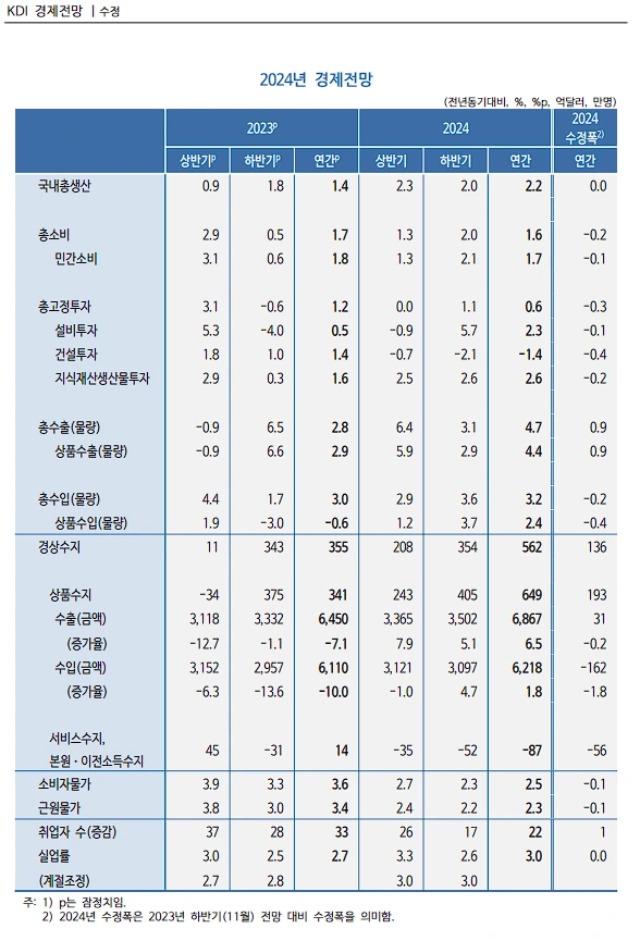 경제 발전과 성장을 이루기 위해서는 정부의 정책 수립과 실행으로 기업의 생산 및 투자, 소비자의 소비 등 다양한 경제 주체들의 활동을 일으켜야 한다. 경제적 발전을 위한 프로세스는 국가의 경제 구조, 산업 구조, 국제 경제 환경 등에 따라 다르나, 대한민국의 내수경기를 강화하고 경제를 발전시키기 위해서는 정부와 지자체의 역할이 상당히 중요하다. 현재 우리나라 내수경기가 어떤지 다들 체감하고 있다고 생각한다. 코로나 19 때 경제 활성화를 위해 수없이 풀었던 돈들을 테이퍼링이나 긴축을 통해 미국이 앞장서서 걷어들이고 있다. 이에 미국의 빅스텝 금리 인상으로 한국도 환율방어 및 인플레이션 방지 목적으로 미국과 발 맞추어 몇 차례 금리 인상을 단행하였다. 물론 미국과의 금리차 역전현상으로만으로 금리를 올렸다고는 할 수 없으나 물가지표를 보더라도 기준금리를 올려야 하는 상황이었다. 소비자들은 쉽게 지갑을 열지 않는다. 2023년 KDI경제전망보고서에 따르면, 아래와 같은 표를 볼 수 있다.