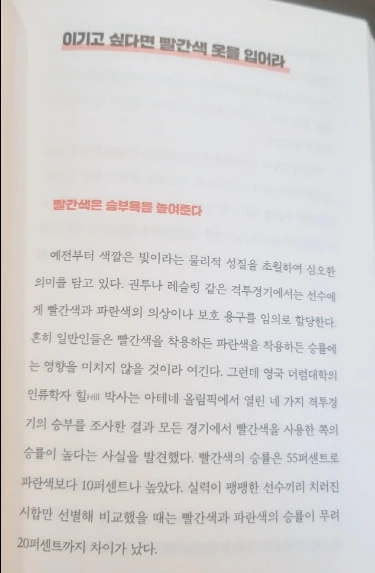 색깔 심리학 중에 하나인 우위론이다. 올림픽을 비롯해 각종 격투기 선수들이 빨간색 유니폼을 입었을 경우, 승률이 55%에 이른다. 심지어 팽팽한 실력끼리 맞붙는다면 20%가 더 올라간다. 영국인 뇌 과학자들은 챔피언스리그, 국대, 프리미어리그 등 축구마저도 빨강 유니폼일수록 승률이 높다는 결과를 도출했다. 이는 뇌에서 빨강을 피로 받아들여, 강한 승부욕을 불러온다고 한다. 패스트푸드점 내부 인테리어도 빨강인 이유는 인간이 배고플 때, 고기와 피를 연상케 하기 때문이다.