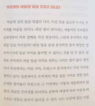프랑스와 중국은 5가지로, 미국과 영국은 6가지로 분류한다. 문화적 배경에 따라 마음에 떠오르는 색의 숫자가 달라진다. 사람은 R, G, B(빨강, 초록, 파랑)의 색깔만 인식한다. 빛의 위대함으로 인한 프리즘이 여러 색으로 보이게 만들 뿐이다.