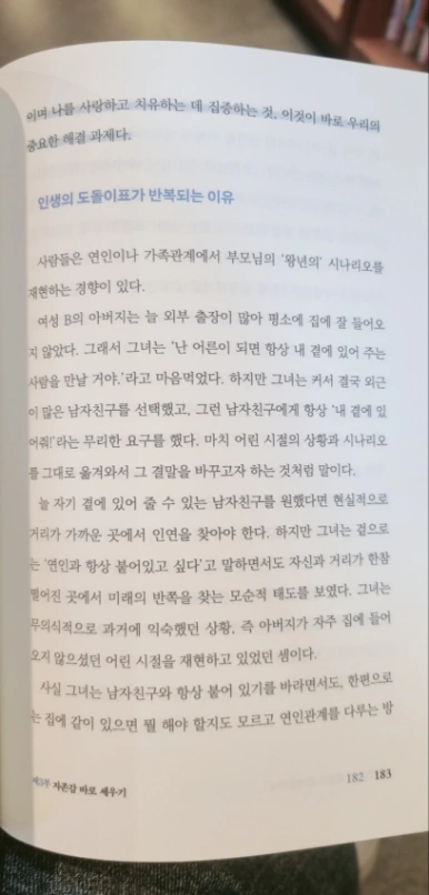자존감은 대부분 유년기에 형성된다. 인생의 도돌이표가 반복되는 이유는 과거 속 가족관계에서 부모님이 나에게 대한 태도와 반응에 맞추어 시나리오를 재현하는 경향이 깊다.