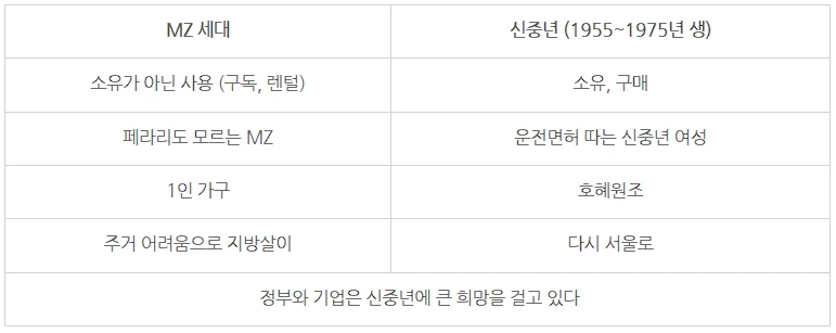 기업은 MZ 세대와 신 중년(1,700만 명 베이비 부머 세대)의 소비 트렌드가 다르다는 점을 파악했다.