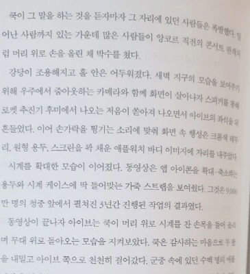 강당이 조용해지고 홀 안은 다시 어두워졌다. 우주에서 지구의 모습을 줌 아웃하는 카메라와 함께 화면이 살아났다. 스크린을 꽉 채운 애플워치 바디 이미지와 함께 쿡은 시계를 찬 손목을 머리위로 자신 있게 들어 올렸다. 9천 명의 환호소리가 조용했던 강당을 강하게 메웠다. 그리고 감사하는 마음으로 두 팔을 벌려 아이브에게 천천히 걸어갔다. 대성공이었다.