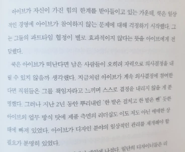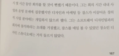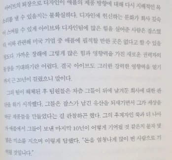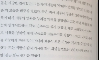 잡스의 유언을 받아들인, 팀 쿡(CEO)과 조너선 아이브(CDO)가 애플을 어떻게 운영했는지 자세히 알게되었다. 저자는 마치 그들 옆에서 같이 먹고, 자고, 싼 것처럼 자세하게 묘사했다.