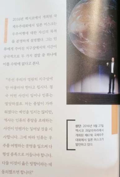 머스크의 비전은 '언젠가는 지구의 멸망이 다가올 수도 있다'라는 생각에서 출발한다.