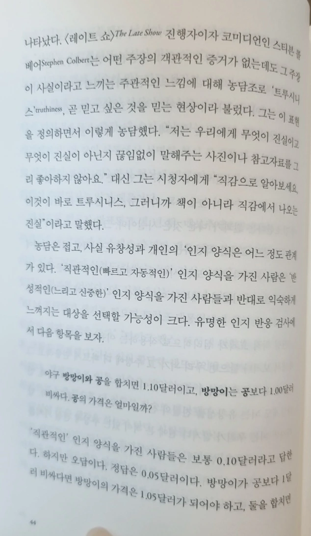저자는 우리의 인식 체계가 얼마나 비합리적인지를 지적하면서, 사람들은 증거보다는 신념에 더 열중하는 경향이 있다고 한다. 뇌는 시각적 수용으로 정보를 처리할 때마다 감정적, 직관적 반응을 우선시한다. 정보처리 능력과 관련된 간단한 예는 아래와 같다.
