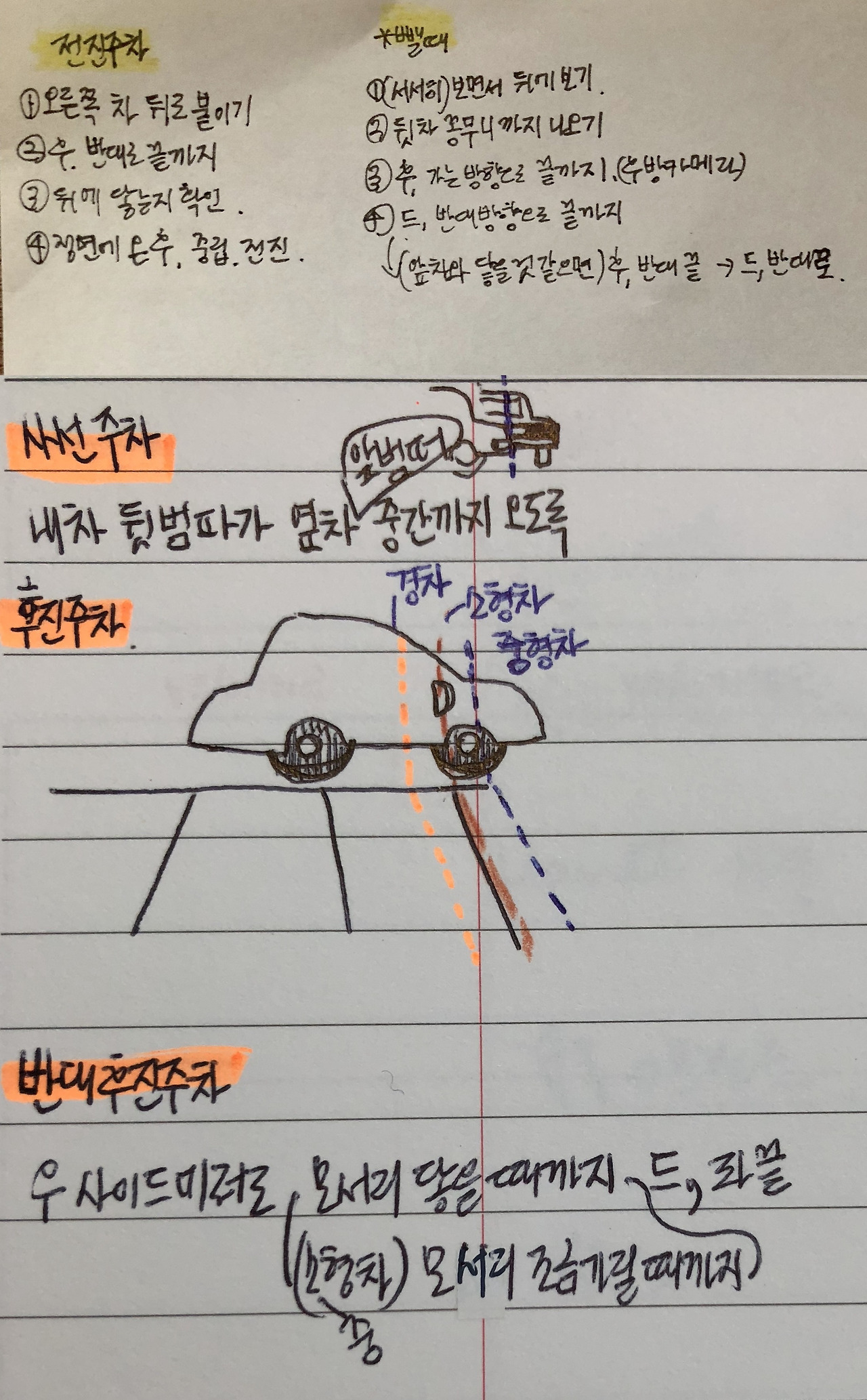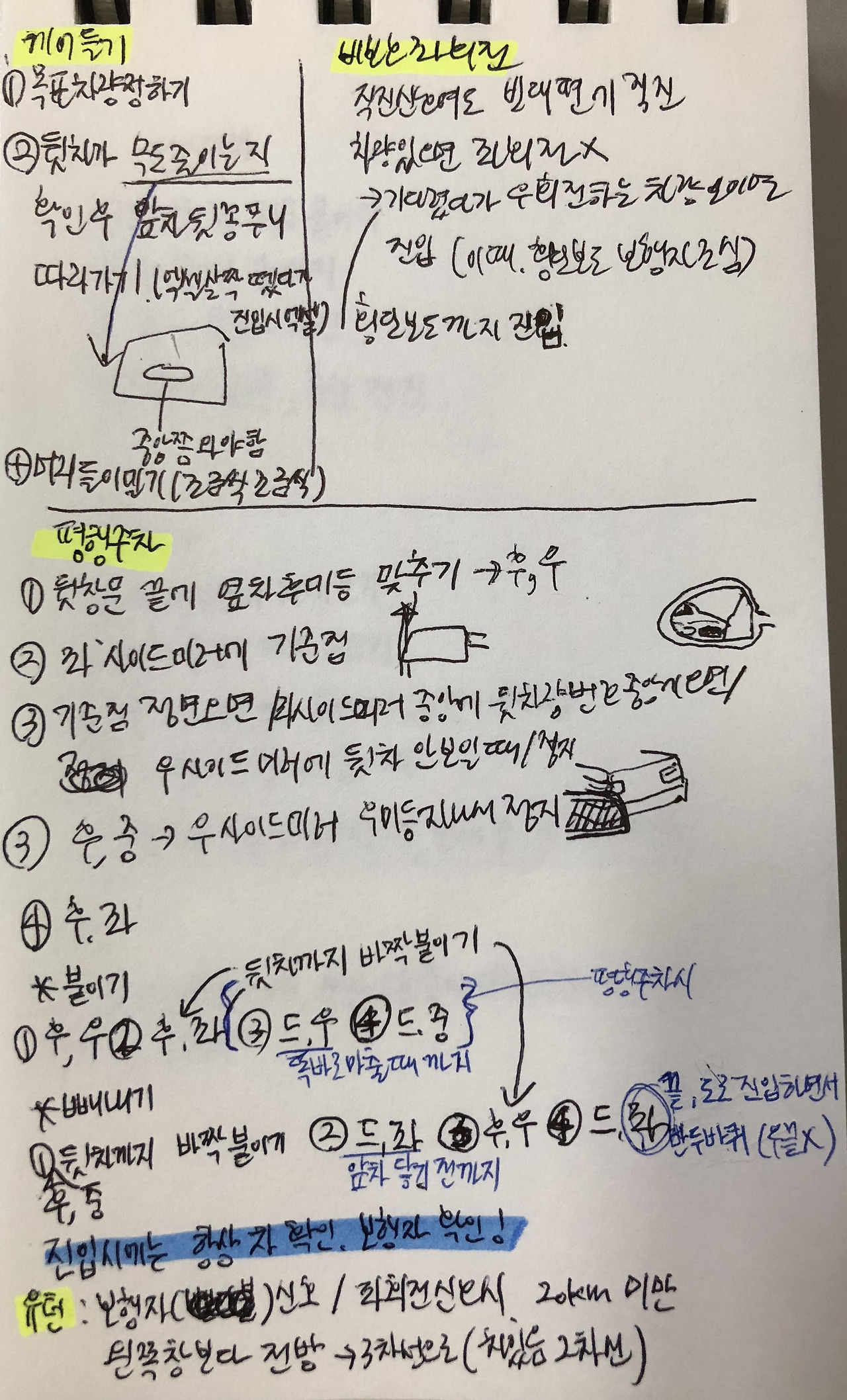 미남쌤 유튜브로 후진주차, 평행주차, 모의 주행 등 필기까지 해가며 참 열심히 공부했다. 아직도 익숙지 않은 주차를 하게 될 때면 이때 필기했던 노트를 꺼내보곤 한다. 형광펜에 밑줄까지 지금 생각하면 이렇게까지 하다니 절박했던 내 모습에 실소가 난다.
