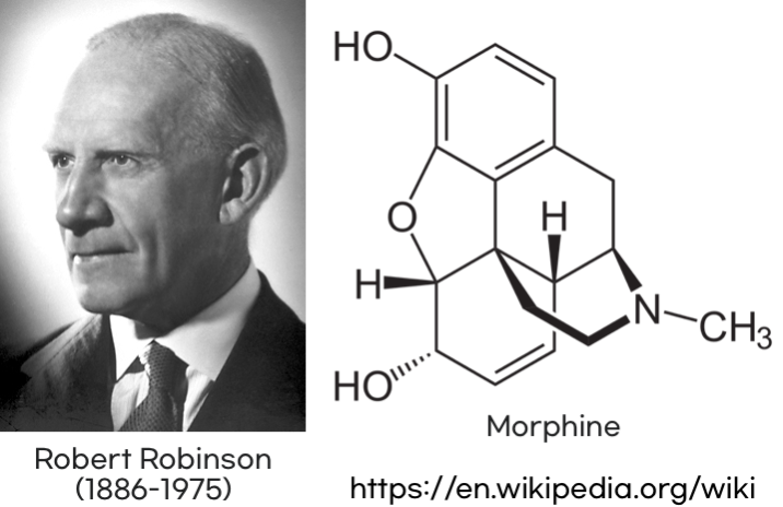 ‘어떻게 이런 양면적인 작용이 가능한가?’에 대한 해답을 찾기 위해 수많은 화학자들이 도전장을 내밀었지만, 모르핀의 분자 구조는 쉽게 드러나지 않았습니다. 분광 분석 기술조차 없던 시절, 그 구조를 처음으로 밝혀낸 이는 영국의 화학자 로버트 로빈슨(Robert Robinson, 1886-1975)이었습니다. 그는 1925년, 4개의 고리로 구성된 모르핀의 복잡한 구조를 수학적・화학적 추론만으로 밝혀내는 데 성공합니다. 이 업적은 유기화학의 결정적인 전진이었고, 그는 1939년 기사 작위를, 1947년에는 노벨 화학상을 수상하게 됩니다.