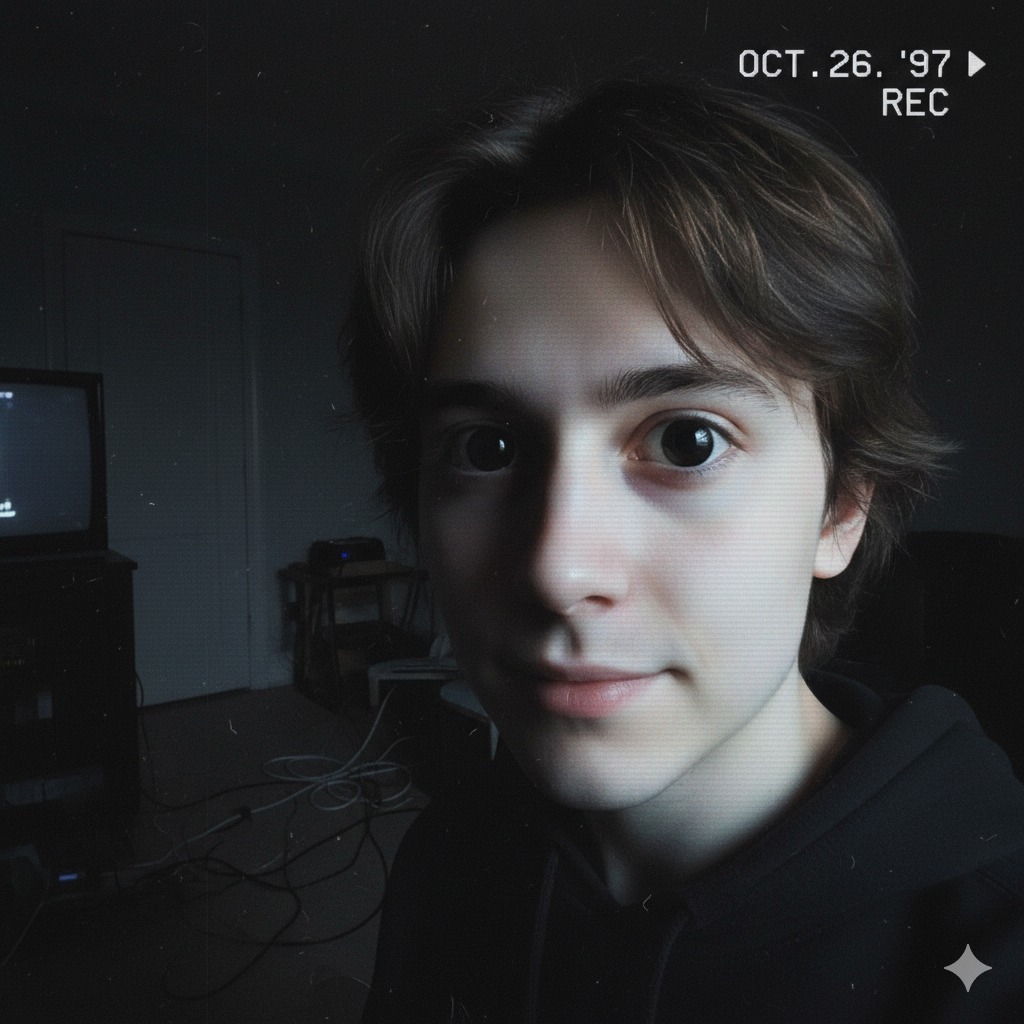 > 신비롭고 성별이 모호한, 반은 소년 같고 반은 소녀 같은 형체가 화면에 등장하며, 그의 눈은 클로즈업되어 있다. 화질은 VHS급이고, 방은 어두워 TV 불빛만 은은하게 비춰진다.