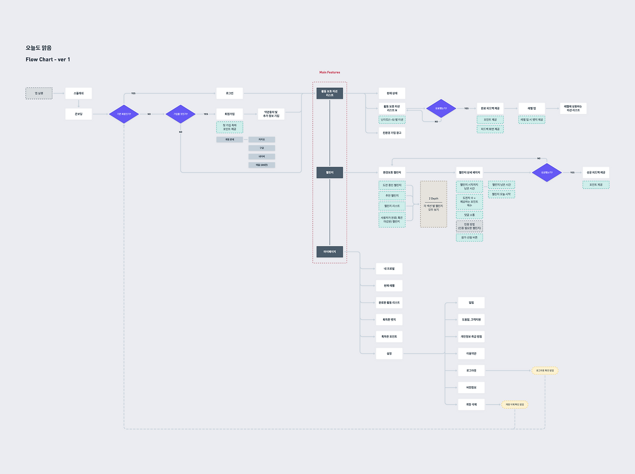 MVP로 도출한 Main Features 2가지와 마이페이지(설정)를 중심으로 앱 실행부터 로그아웃, 탈퇴까지의 여정을 그리고 있다. 실천 완료 여부나 챌린지 성공 여부 등 각각의 시나리오에 따라 사용자의 루트가 달라지고 있다는 점을 확인할 수 있다.