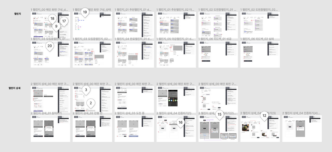 Hi-Fi 와이어프레임으로 작업하기 전, 러프한 스케치로 작업한 시나리오를 바탕으로 화면 설계의 과정을 디테일하게 작성하였다. 예를 들어, 챌린지 리스트 구성 시 내가 고려하며 작성한 부분은 아래와 같이 UX적인 부분뿐만 아니라 실제 데이터를 사용하는 것까지 디테일하게 작성하였다.