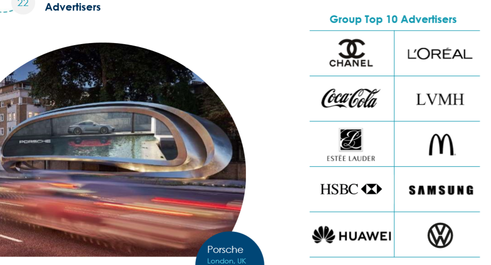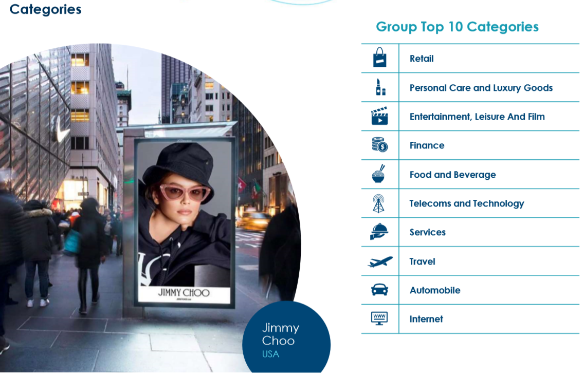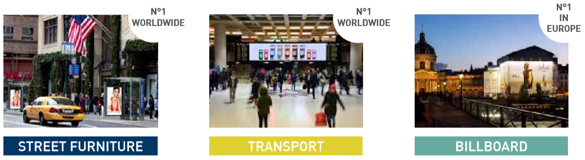 이 회사의 비즈니스 모델은 크게 세 가지이다. 첫 번째는 도심 내 디지털 버스 정류장과 디지털 키오스크 사업을 하는 스트리트 퍼니처 사업(Street Furniture), 공항이나 역사에서 디지털 키오스크와 대형 스크린을 통한 교통 사업(Transportation), 마지막은 도심 주요 지점에 대형 디지털 스크린을 설치/운영하는 하는 빌보드 광고 사업이다. (Billboard Adversiting) 각 사업 영역에서 대부분 글로벌 No1을 차지하고 있을 정도로 시장 장약력과 사업 노하우를 가지고 있다.