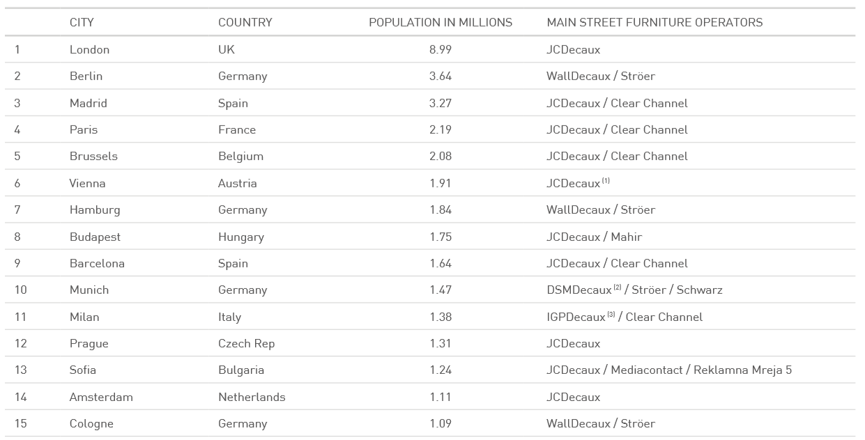 유럽지역의 스트리트 퍼니처(street furniture) 사업의 점유율과 도시별 사업 현황은 하기와 같다(Top 15 기준) 아울러, 입찰 형태와 시점, 그리고 도시에 따라서는 경쟁업체와 Dual Operator로 운영되기도 한다.