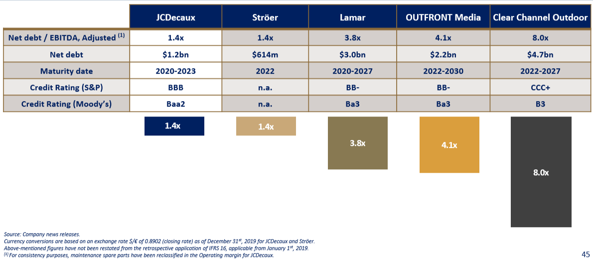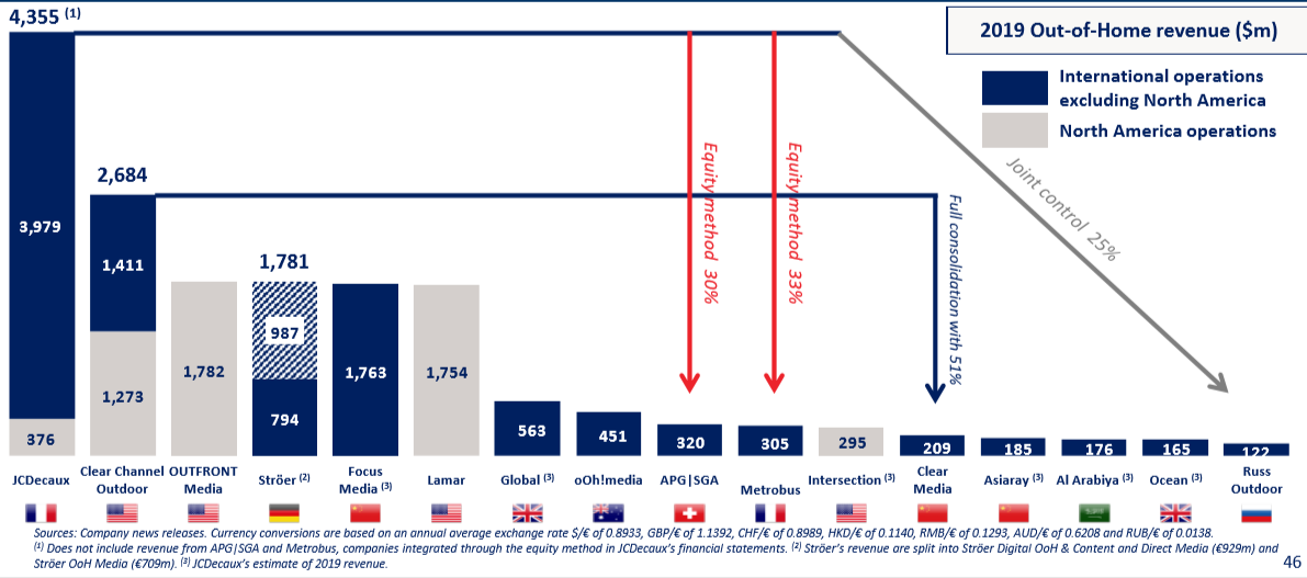 경쟁사 대비해서 40% 매출이 높다. 북미를 제외한 글로벌 시장에서 경쟁사 대비 2배 이상의 매출을 일으키고 있다. 2위 업체인 Clear Channel은 제외하고는 대부분 해당 국가 내에서 사업을 하고 있지만, 제이씨데코(JCDecaux)의 경우, 전 세계 80개 국에서 본인들의 가장 큰 강점인 디지털 버스 정류장 사업을 강하게 드라이브하고 있고, 40% 이상의 매출도 스트리트 퍼니처(Street Furniture) 사업에서 발생된다.