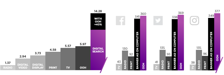 미디어 믹스에 OOH를 추가할 경우, 검색 광고 투자 수익이 40 % 증가한다. 특히 OOH는 패션 브랜드 광고에 큰 효과가 있다. 아울러, OOH는 다른 미디어보다 광고 비용 대비 4배 이상의 소셜/디지털 활성화를 유도한다. 영국에서는 18세 이상 성인은 적어도 일주일에 한 번 이상은 OOH 광고를 본다고 응답했고, 아울러, 미국에서는 OOH 광고를 본 후, 성인의 38%가 Facebook을 방문하거나, Facebook에 글을 남긴다고 하며, 4명 중 1명은 OOH 광고를 본 후, Instagram 포스팅을 했다고 한다.