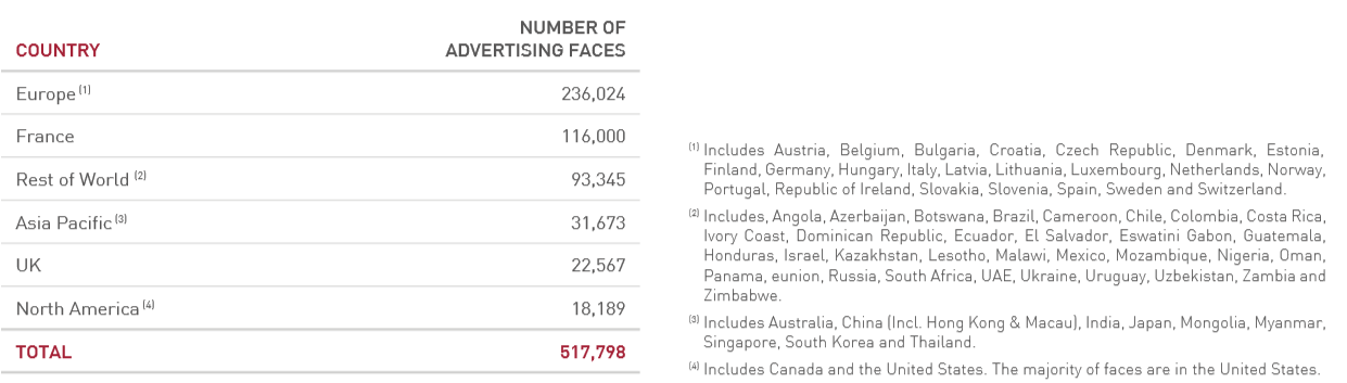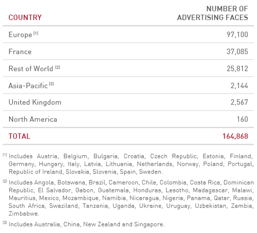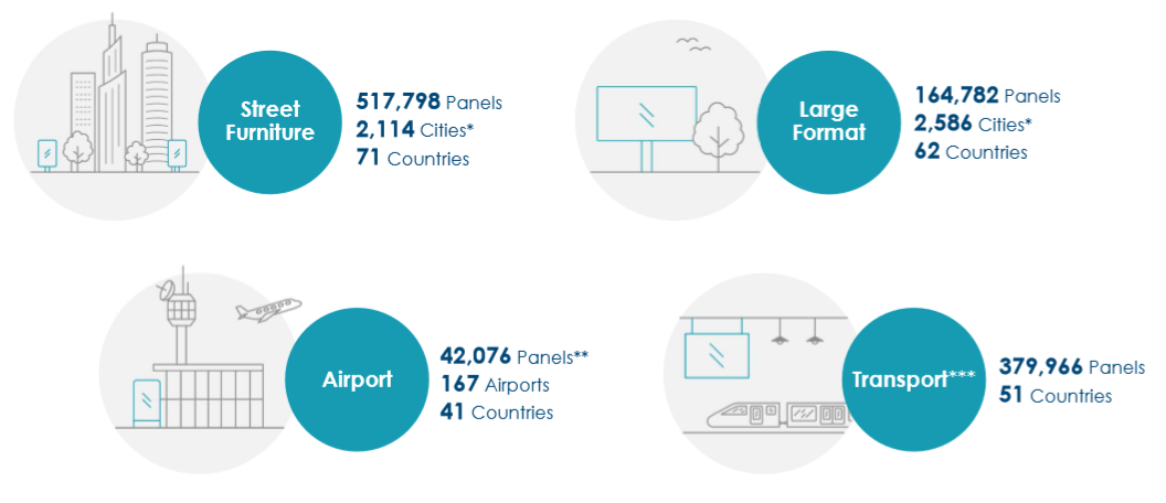 빌보드 계약은 일반적으로 토지 및 개인 건물 소유자로부터 사이트를 임대하고 임대료를 지불한다. 국가에 귀속된 사이트는 일반적으로 공개 입찰 형태로 진행된다. '19년 말 기준으로 유럽 23개 국가(2,246 도시)와 아시아 4개국(호주, 홍콩, 뉴질랜드, 싱가포르)에 총 165,535대의 빌보드를 운영하고 있다. 기존에는 대부분 아날로그 광고판을 사용했으나, 신규 계약은 90% 이상 디지털로 진행되며, 교체 수요도 대부분 디지털로 보면 된다.