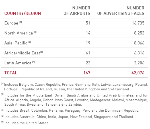 유럽 내에서는 51개 공항, 아시아는 4개, 미국은 뉴욕(JFK, La Guardia and Newark) LA, Dallas Fort Worth, Miami와 Huston 등 5개 공항, 그리고 중동과 아프리카 지역에는 2개 공항에서 사업을 진행 중이다.