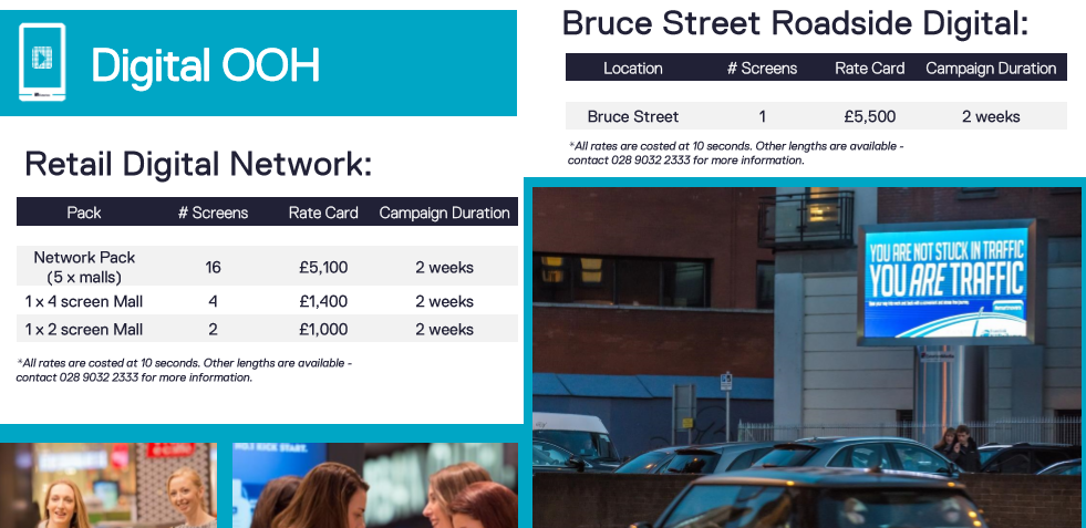 광고 견적은 각 미디어 업체별로 "Rate Card"를 통해서 제공한다. 대부분 온라인을 통해 요청하면 견적을 받을 수 있다. 견적은 제품과 설치 사이트에 따라 천차만별이다. 예를 들어, 미국 버스 정류장의 디지털 스크린 1대 기준의 광고비용은 $3,000~$6,000(4주 기준)이다. 도심 내 주요 Spot일수록 Rate Card 비용이 올라간다. 전 세계 도시 중에서 뉴욕 맨해튼 광고 Rate Card가 가장 높다.