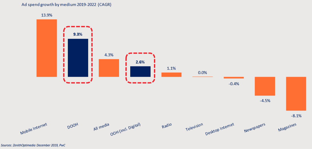 전통적인 미디어 채널 중에서 향후 지속적인 성장이 예상되는 채널은 모바일과 OOH / DOOH이다. 따라서, 효과적인 광고 활동을 위해서는 최적의 채널 믹스 개발하고, 여기에 집중하는 전략이 필요하다.