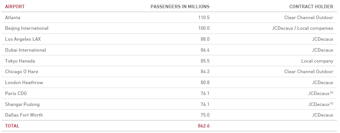 이러한 공항의 사업 장점을 충분히 활용하기 위해 전 세계 허브공항을 중심으로 광고 사업권을 확보하기 위해서 많은 미디어 업체들이 영업활동을 하고 있다. 스트리트 퍼니처(Street Furniture)와 유사하게 대부분의 글로벌 허브 공항은 제이씨데코가 광고 사업권을 가지고 있다.