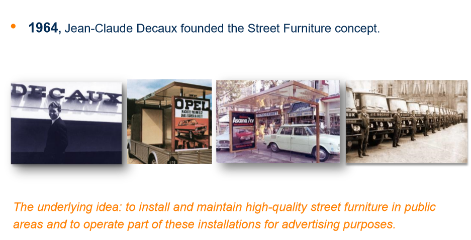 1964년 창업자인 Jean-Claude Decaux가 최초로 구상한 아이디어로, 버스 정류장을 프랑스 교통당국에 무료로 제공하고 관리하면서 대신 버스 정류장에서 광고사업을 할 수 있는 사업권을 따내는데서부터 시작됐다. 초기에는 종이 프린트물 등 아날로그 기반의 매체로 광고 활동을 전개하였고, 2010년 이후부터 디지털 스크린을 적용한 디지털 버스 정류장 콘셉트를 개발했다. 이 시점을 전후로 유수의 건축가와 디자이너와 공동으로 버스 정류장 작업을 공동으로 전개하기 시작했다.