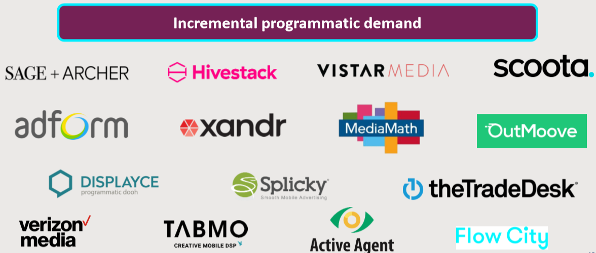 대형 빌보드는 전체 매출의 14.5%를 차지한다. 이 사업은 많은 사람들에게도 익숙한데, 일반적으로 주요 교차로와 도심 내 주요 건물에 설치되는 대형 미디어 광고 스크린을 통해 고객들에게 접근한다. 마찬가지로, 아날로그에서 디지털 스크린으로 변화하는 추세이며, 특히 영국에서는 '19년 말 기준으로 디지털 빌보드가 70% 이상을 차지하고 있다.