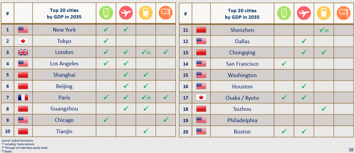 2050년 기준으로 전 세계 인구의 66%가 도시에서 생활할 것으로 예상된다.(2019년 기준으로는 55%) 아울러 앞으로 20년 뒤면 에어택시나 드론 사업 등 Air Traffic도 2배 이상으로 확대될 것으로 보인다. 제이씨데코(JCDecaux)의 강점은 글로벌 Top 20 City에서 강력한 브랜드와 레퍼런스(Reference)를 가지고 있다는 점이다. 도시화가 가속될수록 이들의 영향력은 커진다.