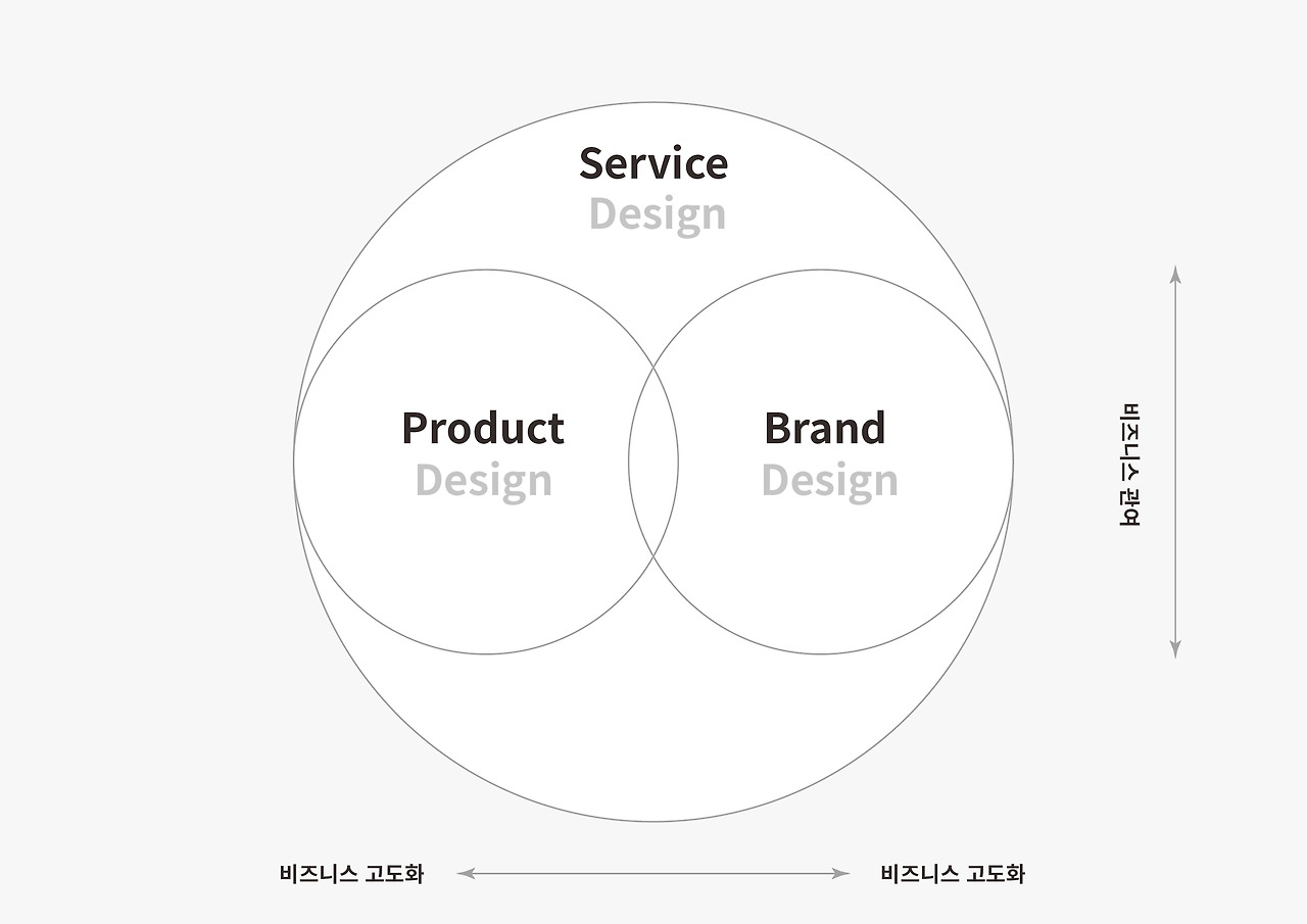 서비스 디자인이란 거대한 비즈니스 생태계를 이해하기 위해선 위에 보이는 관계도를 이해할 필요가 있다. 먼저 서비스 디자인이란 굉장히 포괄적인 개념이며 거시적 개념이다. 이를 설계한다는 것은 하나의 사업을 성장시키기 위한 경영자의 관점을 말한다. 한마디로 가장 최상단에 있는 비즈니스적 사고인 셈이다. 따라서 세부적으로는 프로덕트(비즈니스를 촉발시키는 본질:상품)와 브랜드(상품 판촉의 정체성)의 설계가 적절한 벨런스로 성장하고 고도화되어야 한다. *프로덕트와 브랜드가 꼭 같은 비율로 성장될 필요는 없으며 업의 결에 따라 둘의 성장 속도가 다를 수 있다.
