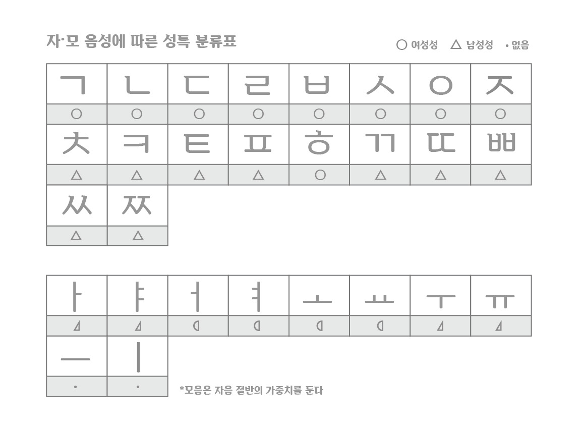 사람의 이름에도 성별에 대한 인식이 존재하듯, 브랜드 네임에도 성별이 존재한다. 여성성을 주로 띄는가 혹은 남성성을 띄는가 그것도 아니면 중성적 이미지인가. 당신의 브랜드가 어떠한 성별로 사용자들을 마주하게 할지 아래의 자·모 음성 기호표를 보고 체크를 해보자.