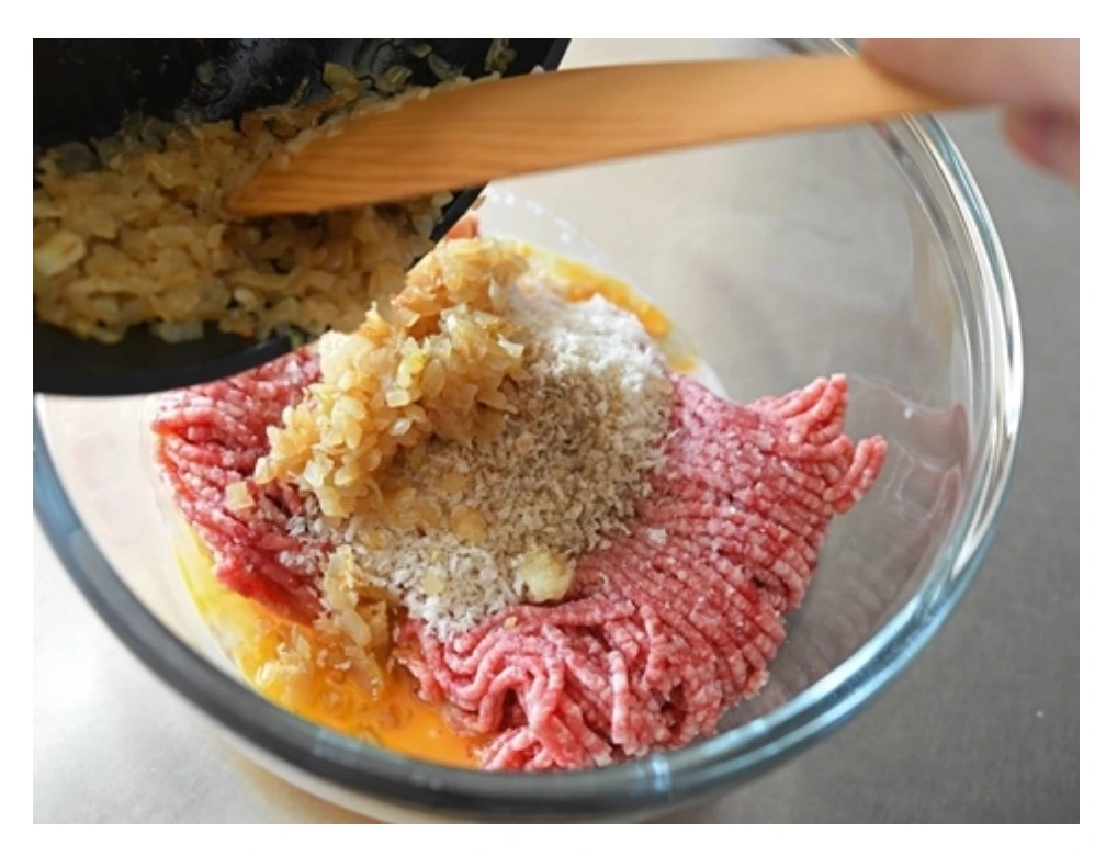 준비한 빵가루에 넛맥 조금, 허브솔트, 후추, 달걀, 우유 약간을 볶아 놓은 양파에 합친다.