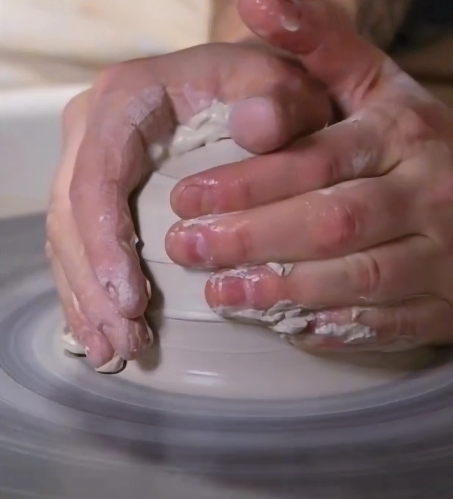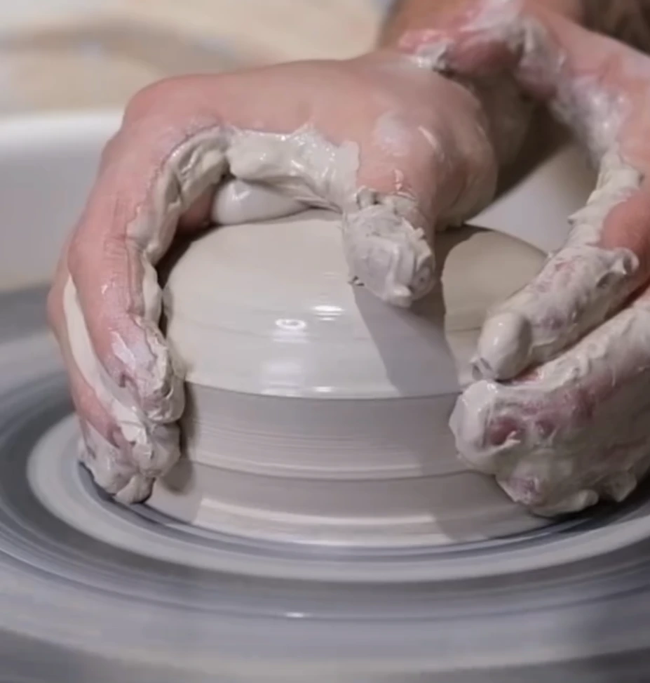 끝까지 같은 회전 속도로 마무리해야 중심을 잘 잡을 수 있어요. 서두르거나 힘의 분배가 균일해야 흙이 물레에서 따로 놀지 않아요.