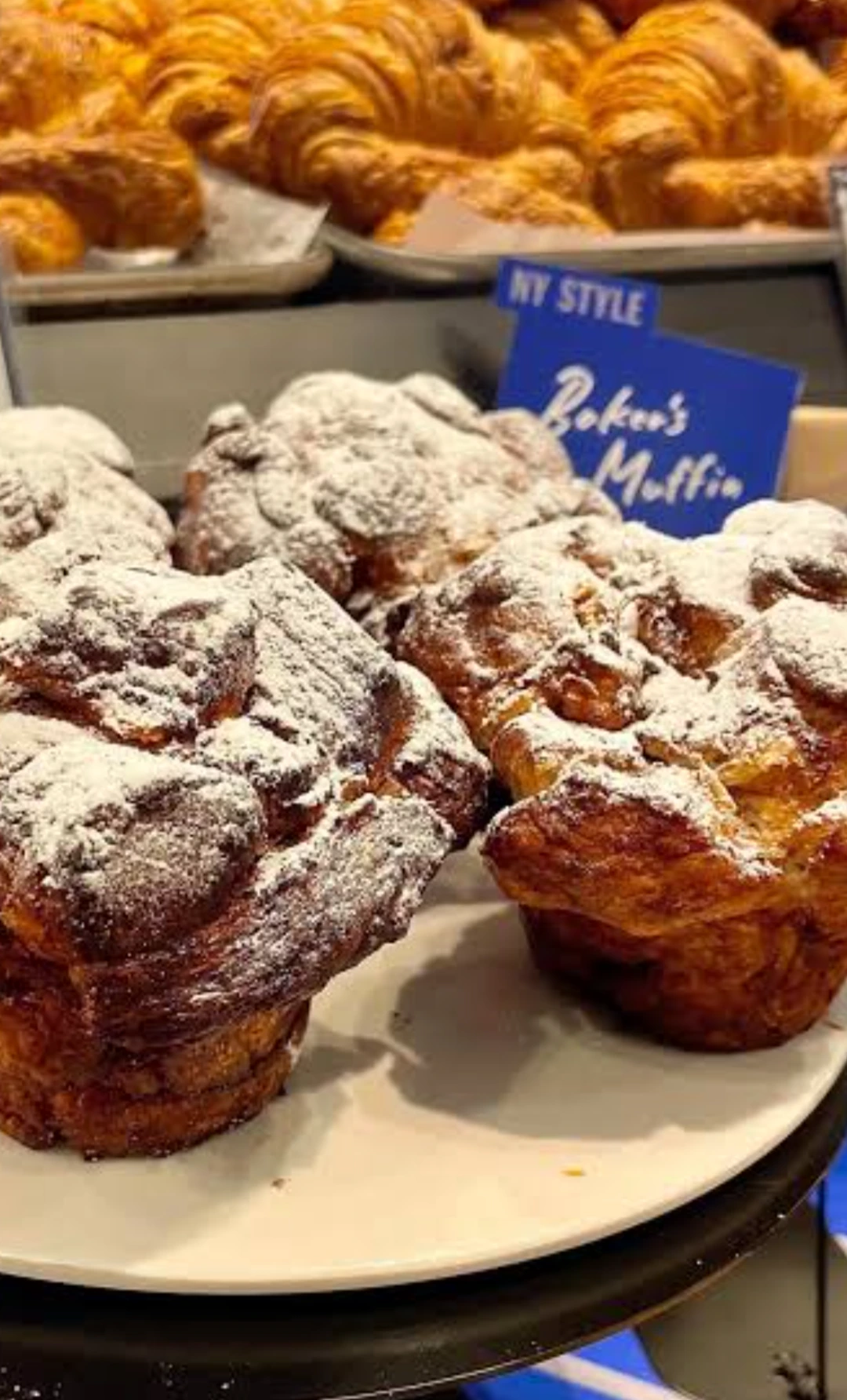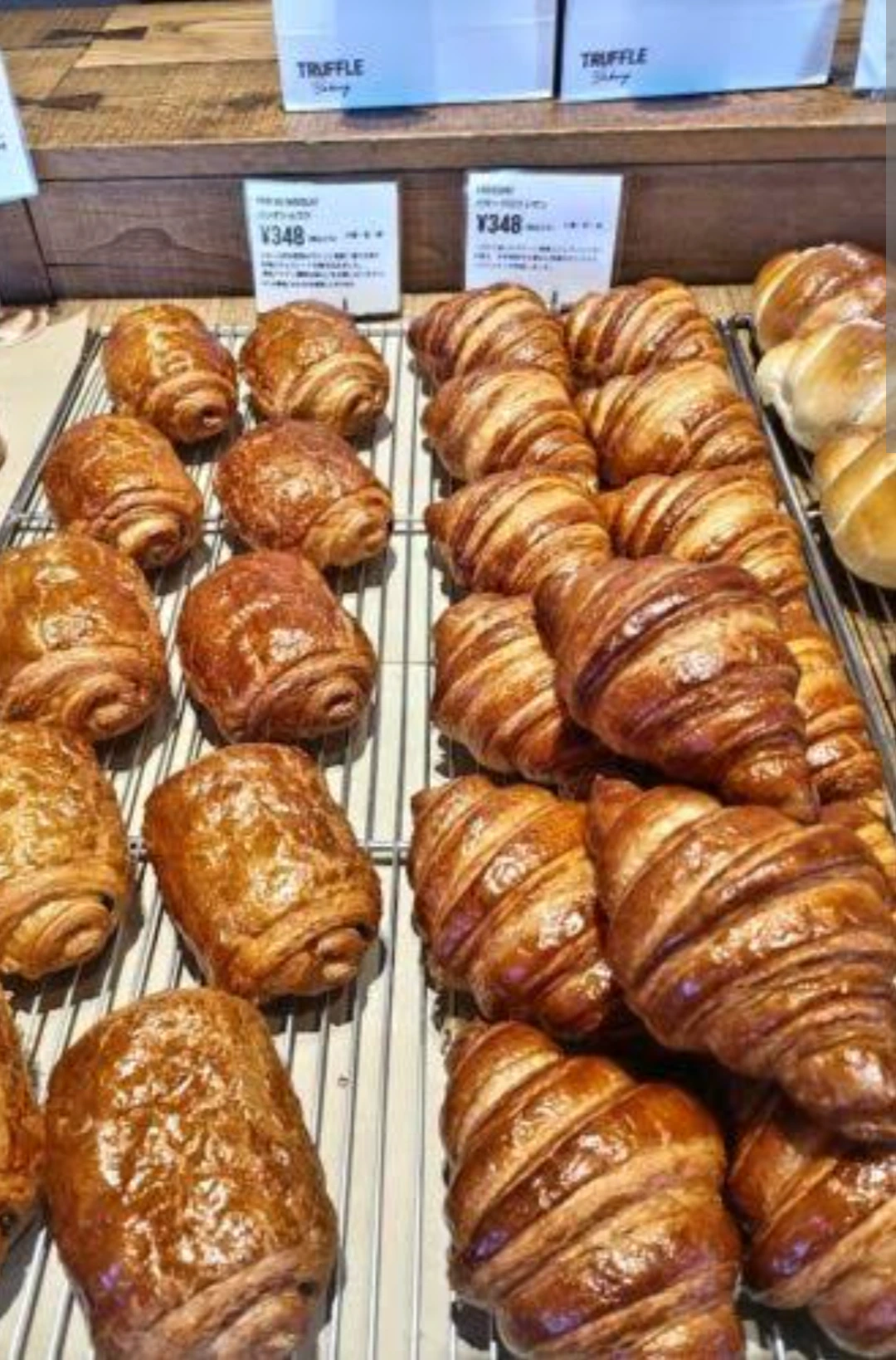 쇼케이스에 나란히 줄 서서 기다리는 겹겹이 버터의 페스츄리들...