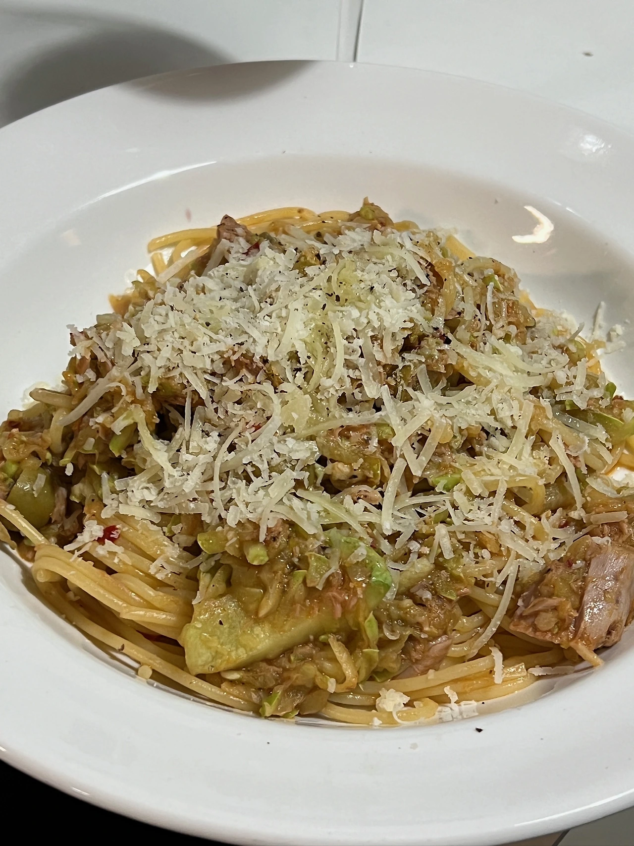 남부 이탈리아, 시칠리아, 몰타 지역에서 흔한 파스타다. 거긴 생참치가 흔해서 생참치로 해먹지만 우리는 참치통조림이 흔하지 않은가. 애호박 하나만 있다면 손쉽게 해먹을 수 있다.
