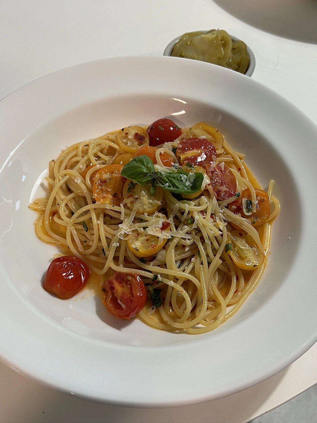 2) 올리브오일에 소금, 후추, 다진마늘 살짝, 칠리플레이크를 더해 향을 내다가 방울토마토를 넣어 뭉글하게 조린다.