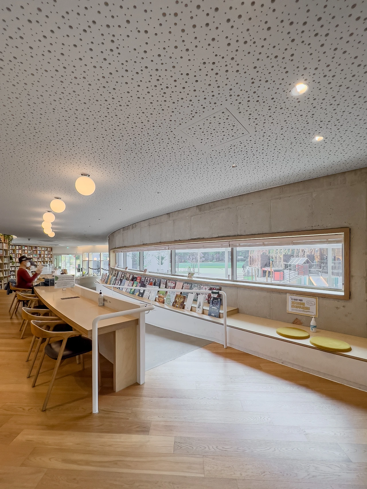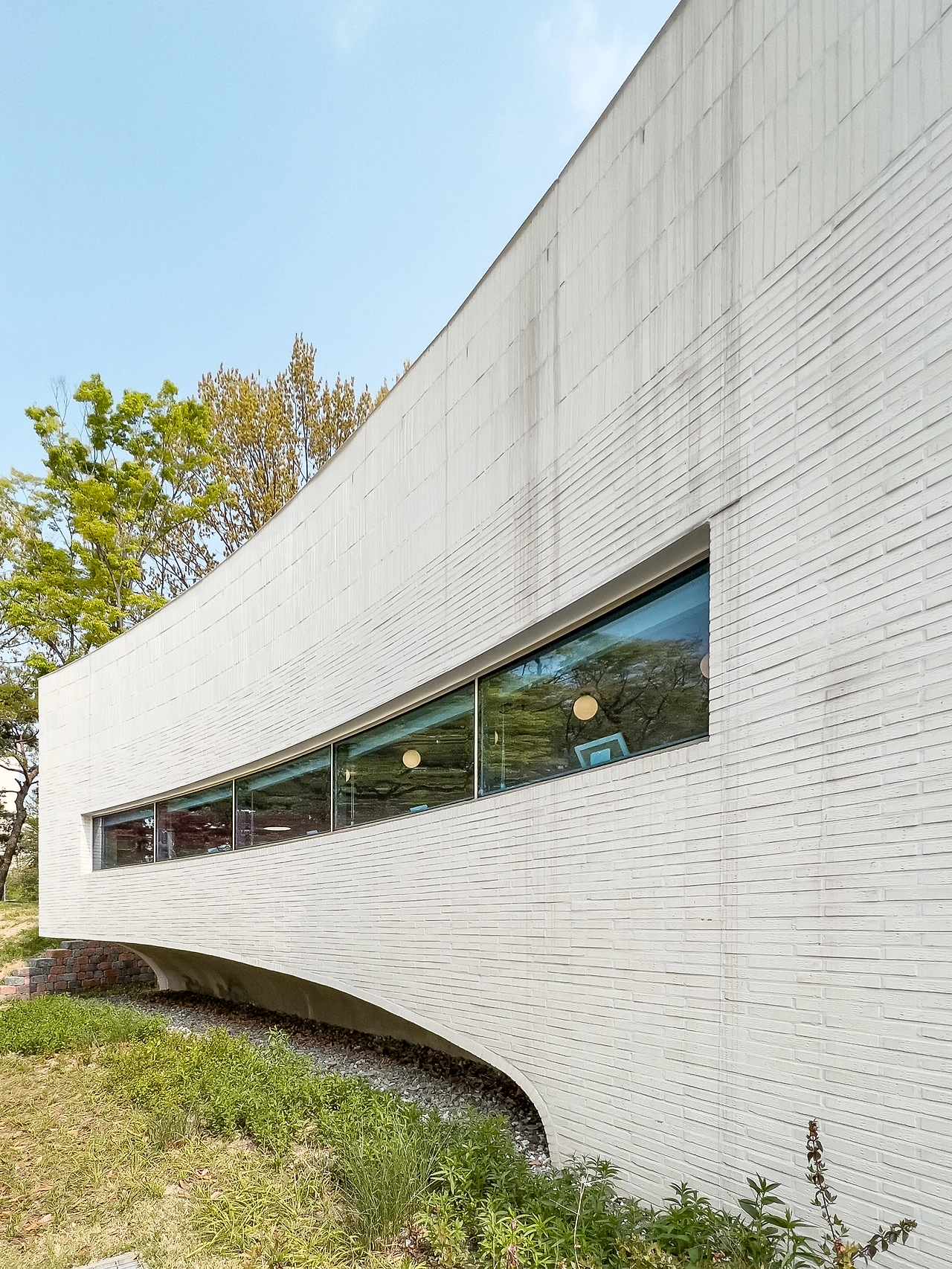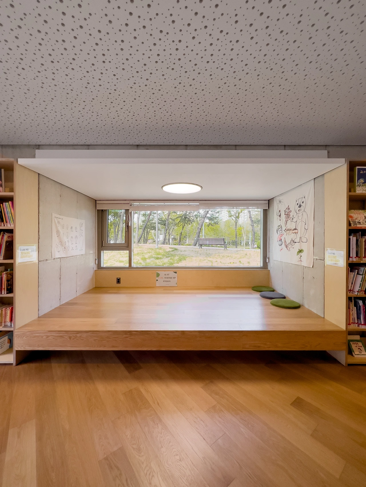 기존에 심어져 있는 느티나무와 감나무를 훼손하지 않기 위해 건물 일부를 원형으로 덜어내고 공원의 언덕도 살렸다. 덕분에 내부 경험은 특별해져, 경사로를 통해 공원의 풍경을 끊김없이 자연스럽게 감상할 수 있다. 계단식 좌석은 폴딩도어와 연계하여 유동적으로 공간이 확장된다.
